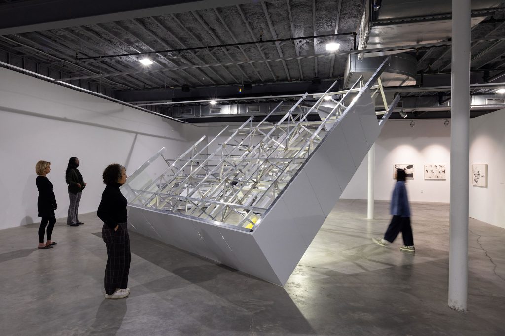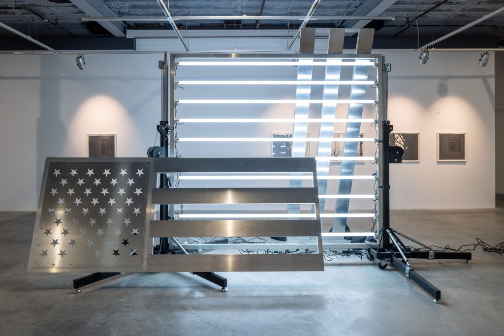 The show, organized by the Visual Arts Advisory Committee with support from Rick Cooper and Ruth Mannes, will center on three extraordinary works, each installed in its own gallery: a massive steel-and-light American flag sculpture, a monumental gas station installation, and a haunting video projection. Together, these works will create a layered narrative that reflects on American excess, its discontents, and an uncertain future.