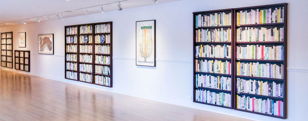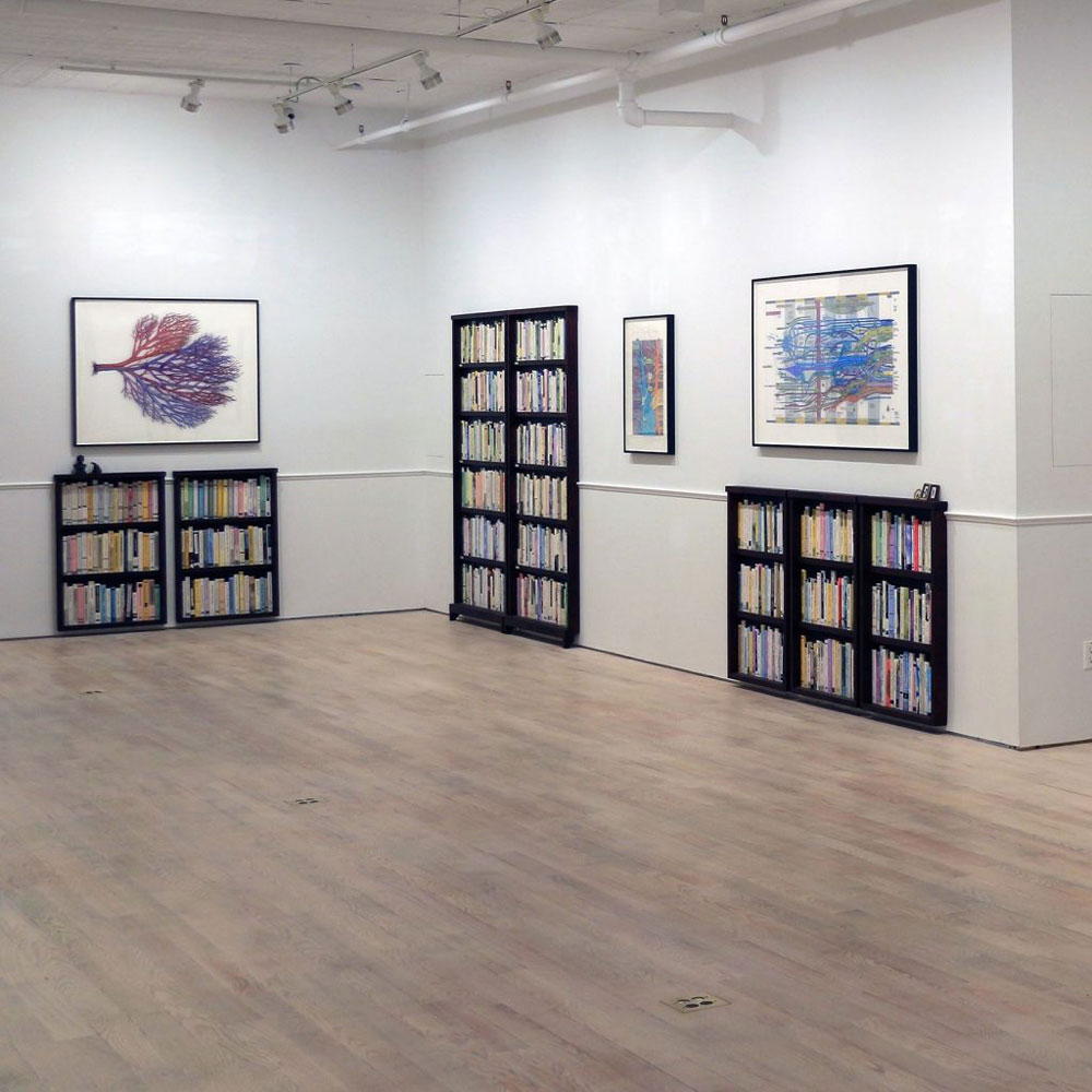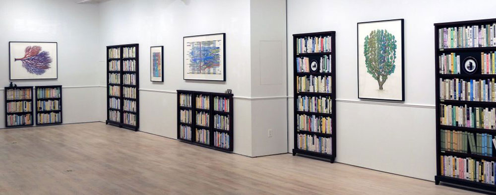 Ward Shelley’s What Keeps Mankind Alive featured a selected group of diagrammatic paintings that tease out narratives from history and culture. The paintings were presented within the context of The Last Library, an ongoing collaboration between Shelley and artist Douglas Paulson. The Last Library featured a room-sized installation of bookcases and 3,000 books that according to Shelley, “should have been written, but haven’t.”